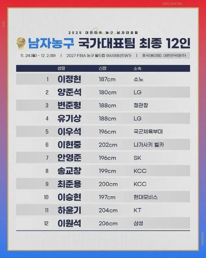 韩国男篮则早早公布了对阵中国男篮的12人大名单,最高2米06,由他们的当家球星李贤重领衔,两队将继今年亚洲杯八强赛之后再次相遇,如下: